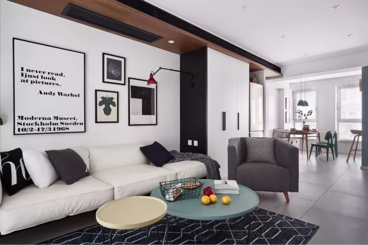 阳台推拉门的墙面刷成青色,沙发背景墙刷白漆并用一组挂画装饰,再搭配舒适的浅色沙发、灰色椅子,地面再铺上一块地毯,简约舒适的客厅就出来了;