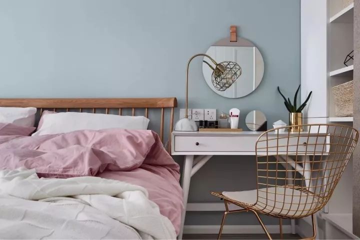 床头摆放一张化妆桌,满足了女主的日常护肤及化妆的需求;