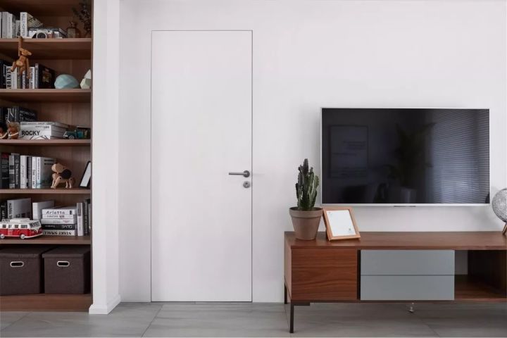电视背景墙简单的刷白漆,所以很好的把进入卧室的门藏起来了,这就是我们常常听到的隐形门;