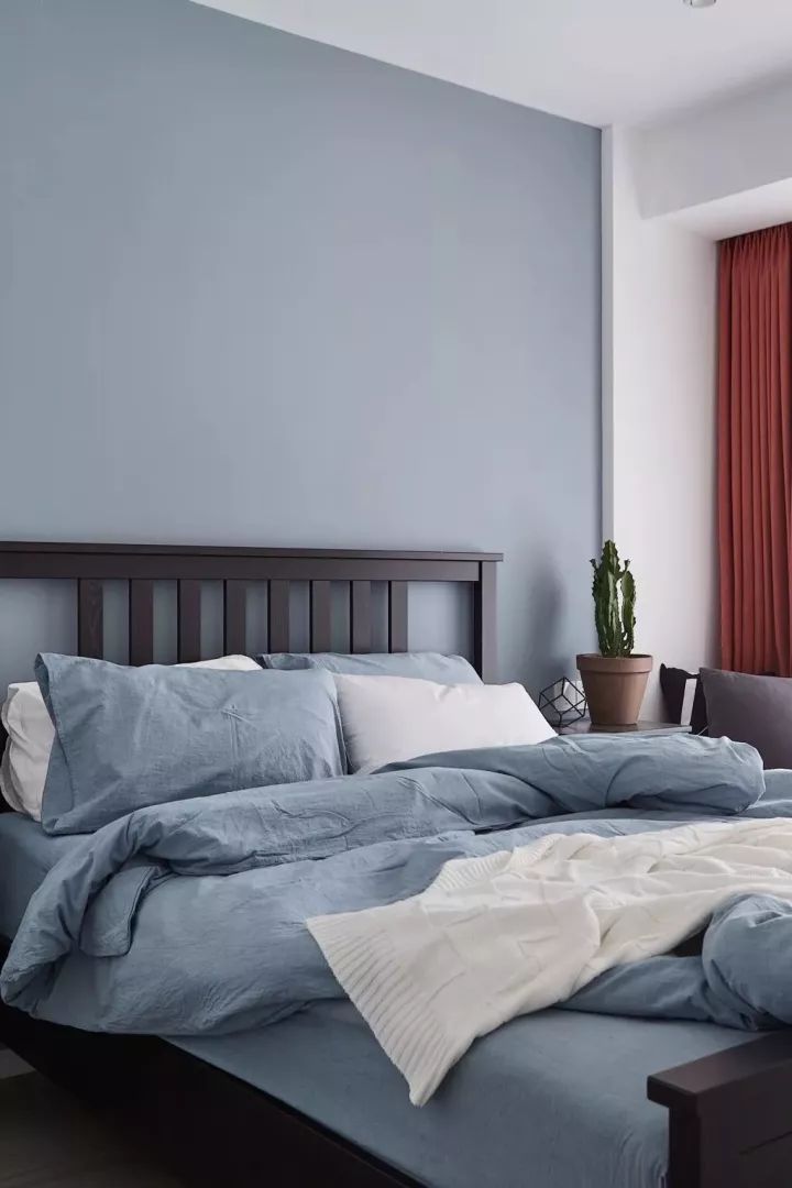 蓝色的背景墙,选用木色的床,再搭配粉色的被子,这样的组合让人百看不厌~