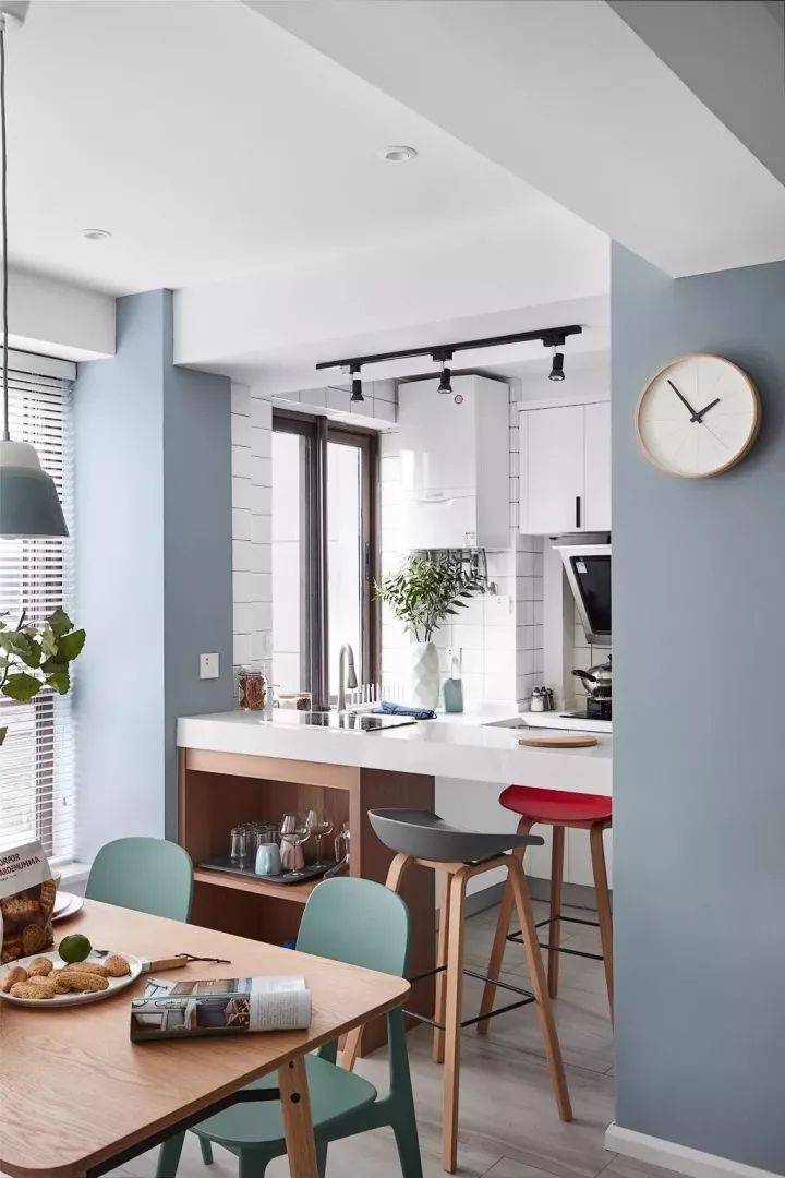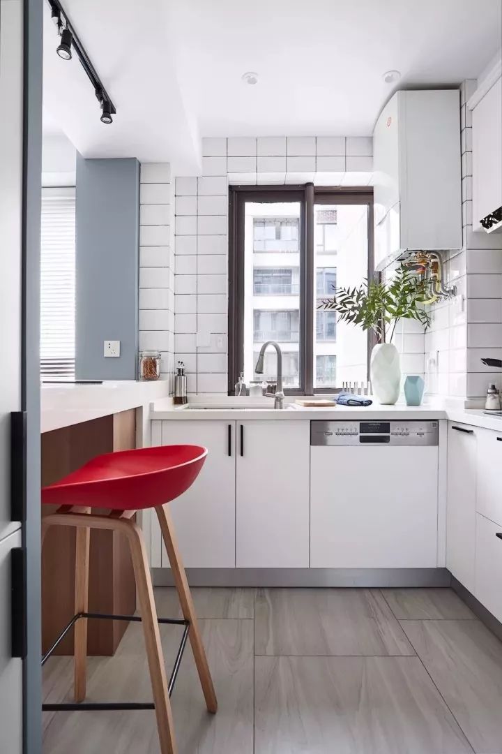 白色的小瓷砖,搭配白色的橱柜,简洁的北欧风很好的呈现出来了;