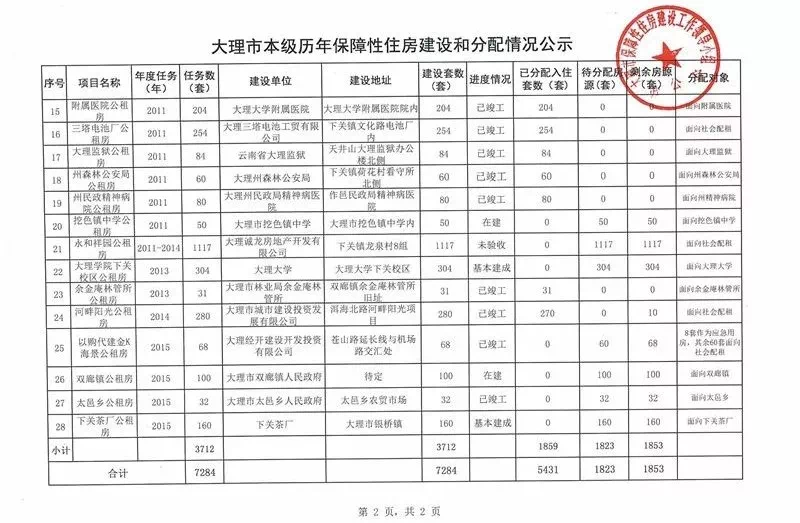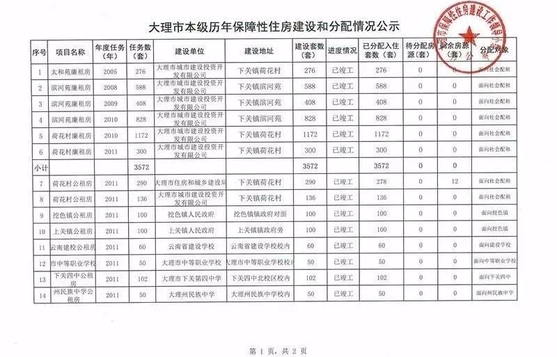 《大理市本级历年保障性住房建设和分配情况公示表》