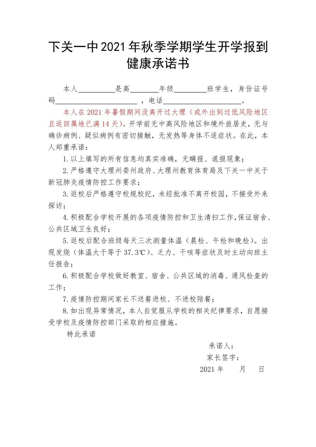 (1)暑假期间没离开过大理或外出到过低风险地区但返回属地已满14天的学生,可按时返校报到,报到时请全程佩戴口罩,于学校大门测量体温合格并出示提前打印的彩色健康码、行程码、新冠疫苗接种凭证或者医疗机构开具的《新冠病毒疫苗暂缓/不可以接种证明》、《下关一中2021年秋季学期学生开学报到健康承诺书》四份材料,(《承诺书》可点击图片下载或者点击文末“阅读原文”下载并如实填写),经校门口查验合格方可进入学校。入校后四份材料交班主任处。