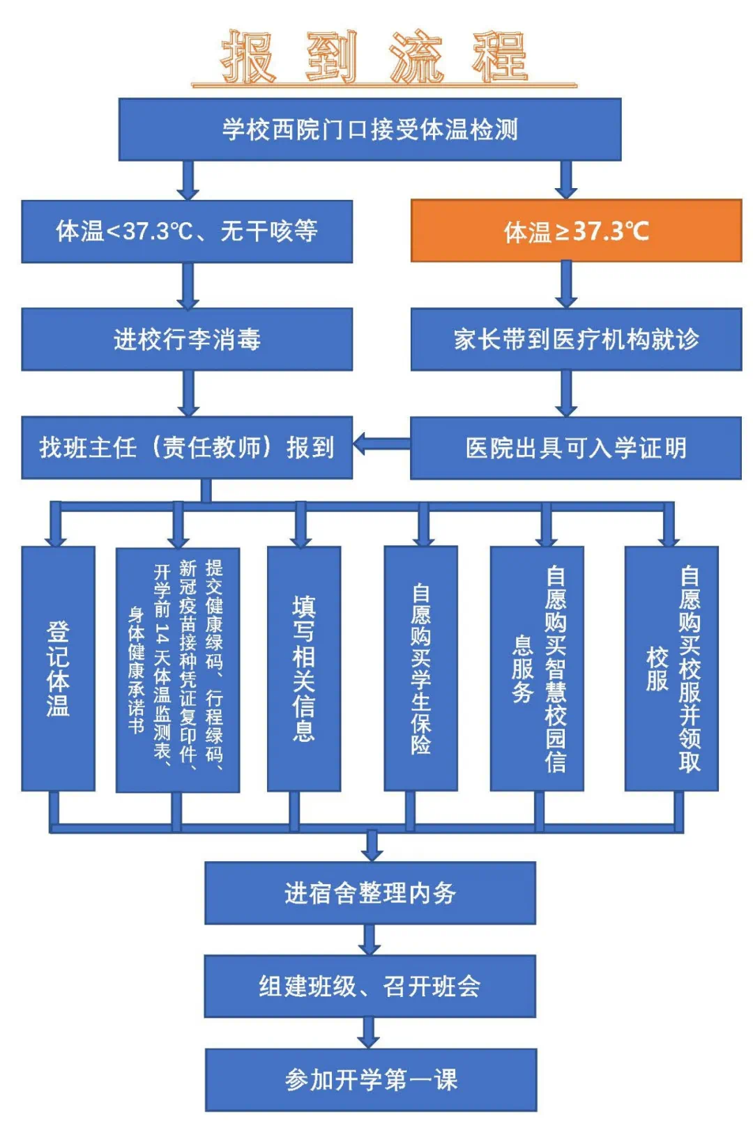 高一新生报到地点设在学校体艺馆北侧广场。请全体高一新生从学校西院西门进入(人民北路4路车站旁),进校前,先进行体温检测,若体温正常,学生报到入学,家长返回,学校安排人员对学生携带行李表面进行消毒。若体温≥37.3℃和伴有干咳、气促等呼吸道症状的同学,将暂缓入校,需由家长带其到相应医疗机构进行诊断排除,治愈后方可报到。