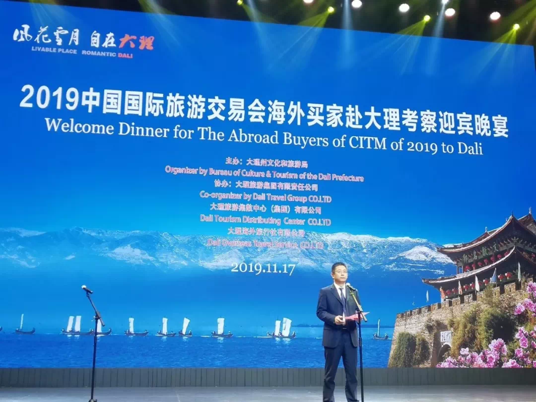 11月17日,2019中国国际旅游交易会海外买家赴大理考察迎宾晚宴现场,大理州人民政府副州长李泽鹏作《“风花雪月·自在大理”》的文化旅游专题推介。向在场的海外嘉宾介绍了大理悠久的历史、灿烂的文化、丰富的文化遗产、良好的生态、秀美的风光及大理旅游产业发展情况。