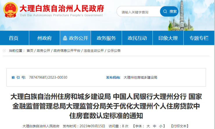 为贯彻落实住房城乡建设部、中国人民银行、金融监管总局《关于优化个人住房贷款中住房套数认定标准的通知》(建房〔2023〕52号)要求,更好满足居民刚性和改善性住房需求,经州人民政府同意,现就优化大理州个人住房贷款中住房套数认定标准通知如下: