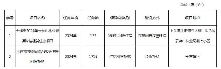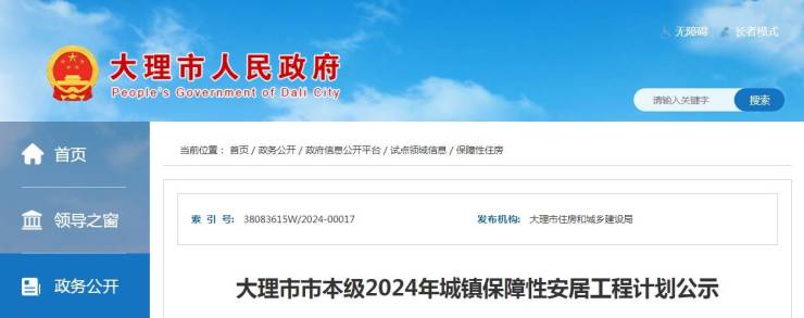 大理市市本级2024年城镇保障性安居工程计划公示