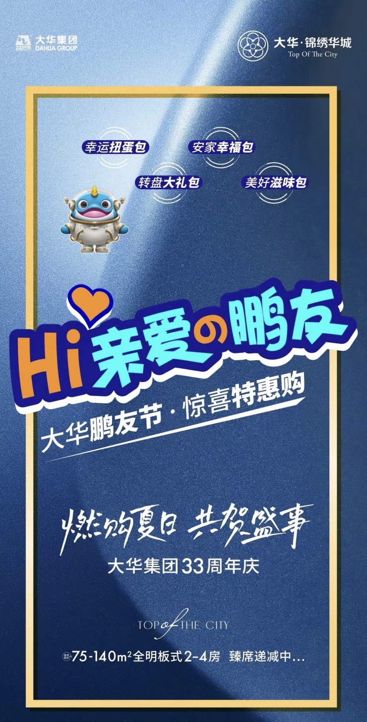 据搜狐焦点大理站获悉,燃购夏日,共贺盛事,大华集团33周年,大华鹏友节·惊喜特惠购,大理大华·锦绣华城,四重大礼包,参与就有礼!