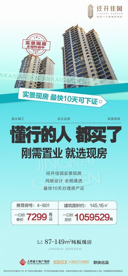 大理经开佳园,由大理惠丰地产集团与大理经开投集团联袂出品,以国企为品质担纲,以知名房企缔造臻品人居,围绕居住品质与健康生活,提供真正改善生活条件的高品质社区!大理经开佳园,纯板现房推荐,一口价单价约7299元/㎡,一口价总价约1059529元!关注大理经开佳园的朋友可前往售楼处现场看房,咨询房源信息请拨打电话400-156-0036 转 414818!