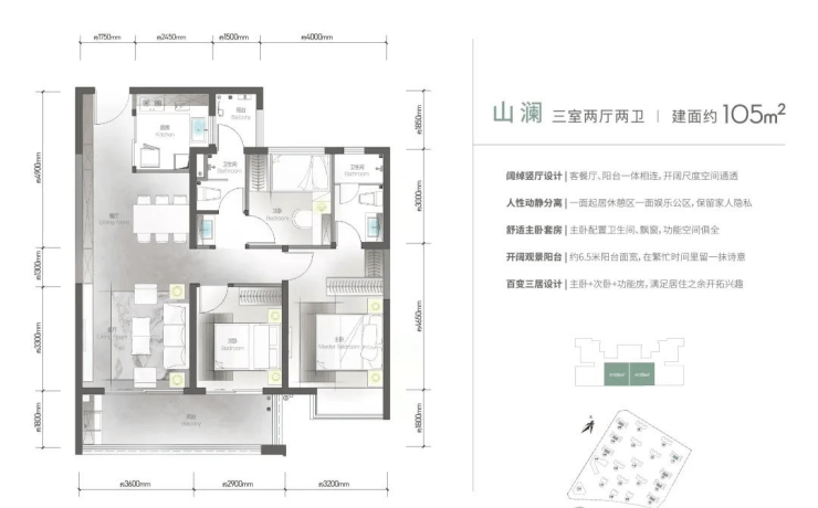 地块情况:项目共分为10个地块开发,其中4块住宅用地,6块商业用地。项目于2020年8月首开A4地块,现A4地块「云溪谷」(已交房)、A6地块「西山月」(一期已交房,新推二期105/144㎡产品在售),A5地块「山海和」(190㎡产品在售)、A7地块「山河万里」(144㎡产品在售)。