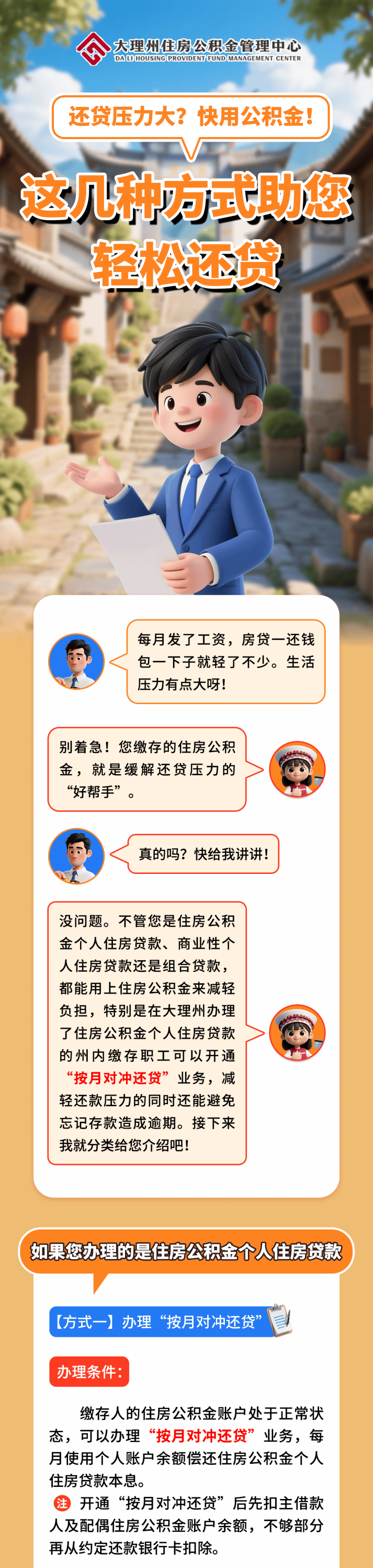 不管您是住房公积金个人住房贷款、商业性个人住房贷款还是组合贷款,都能用上住房公积金来减轻负担,特别是在大理州办理了住房公积金个人住房贷款的州内缴存职工可以开通“按月对冲还贷”业务...