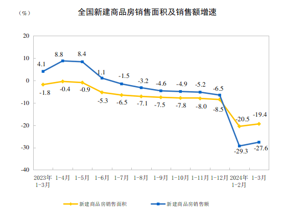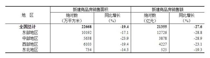 1—3月份,新建商品房销售面积22668万平方米,同比下降19.4%,其中住宅销售面积下降23.4%。新建商品房销售额21355亿元,下降27.6%,其中住宅销售额下降30.7%。