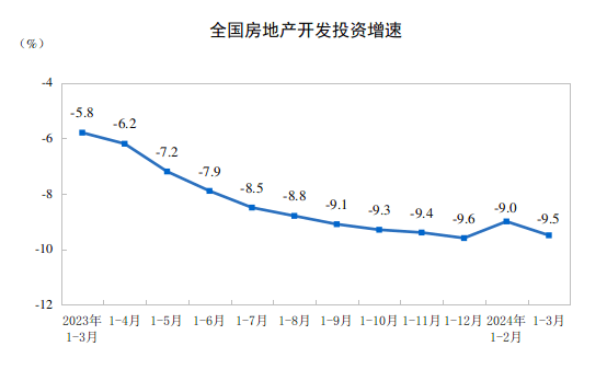1—3月份,全国房地产开发投资22082亿元,同比下降9.5%(按可比口径计算,详见附注6);其中,住宅投资16585亿元,下降10.5%。