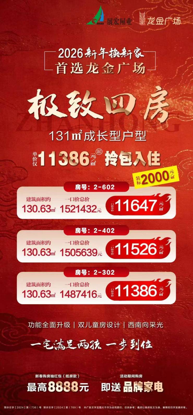 2026新年换新家,首选龙金广场,新春购房抽红包(抵房款)最高8888元,活动期间购房即送品牌家电!!关注展宏·龙金广场的朋友可前往售楼处现场看房,咨询房源信息请拨打电话4001560036 转 451395!