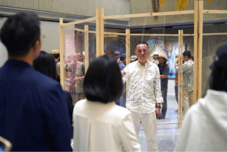 参展艺术家史晶的创作尤为特别,他使用洱海的海土混合糯米,在展馆墙面上绘出若隐若现的苍山十九峰。这种与土地深度连接的艺术创作,正是那山那海所倡导的生活理念的生动体现。另一位艺术家和丽斌则带来了《须臾》盲画行为装置,通过闭眼作画的方式,展现内心与自然的对话。