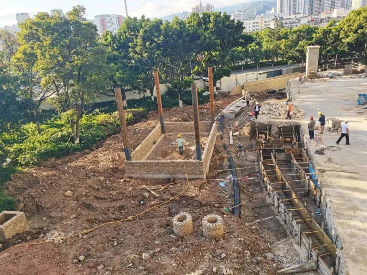 一期附属工程7月30日开始动工,地下管道铺设已基本完成,正在进行附属土建工程施工。