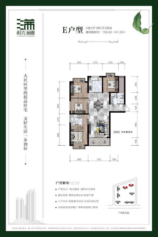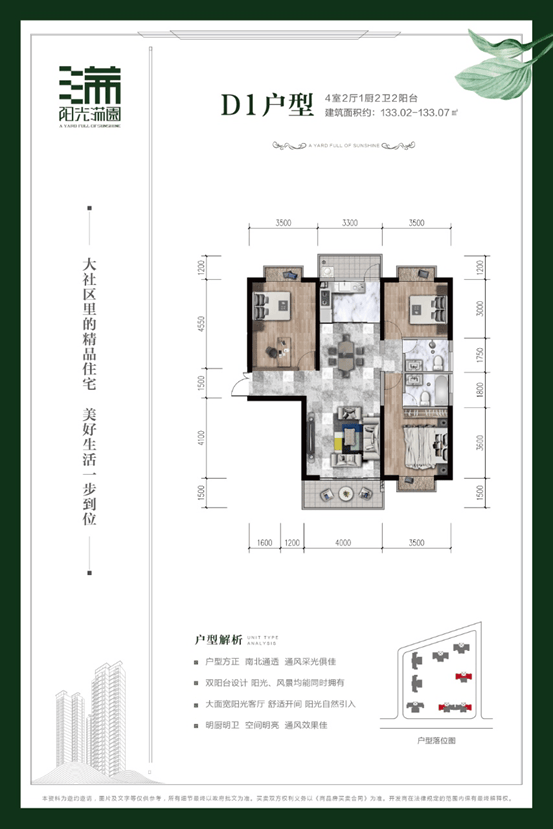 项目楼栋分布:1、2、3、4、5、6号楼主体建筑座北朝南,其中1号楼是两梯四户的布局,2、3、4、5、6 号楼是两梯三户布局,户型设计从2室2厅1厨1卫到4室2厅1厨2卫,同时户型各功能区域均有较好的通风、采阳和景观视野。