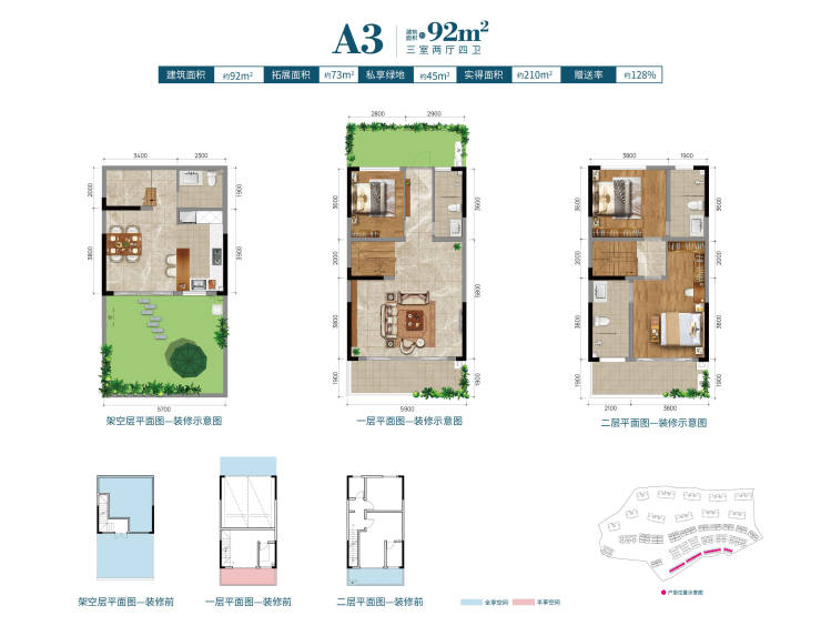 ?建筑面积92㎡,实得面积约210㎡,部分楼栋另有自行拓展面积;