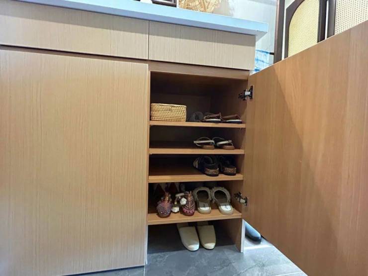 门板后收纳鞋子,底层悬空区域收纳家居拖鞋等