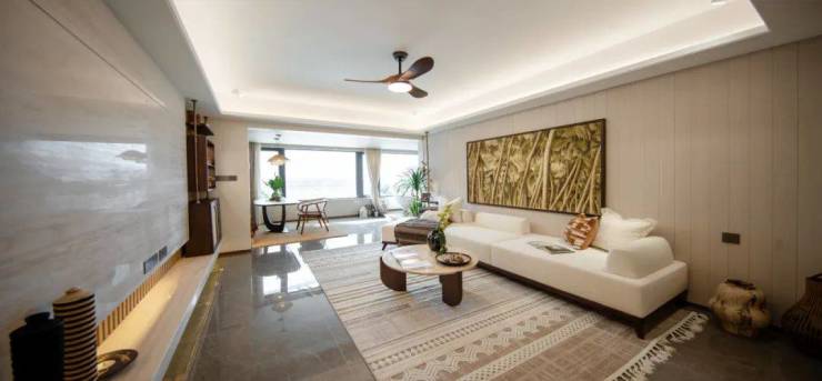 99㎡样板间打造约4m阔尺面宽客厅,可改造为功能多样化会客厅,容纳小型酒会、午夜微醺,随时随地开辟出旅居生活的“第N种”可能。