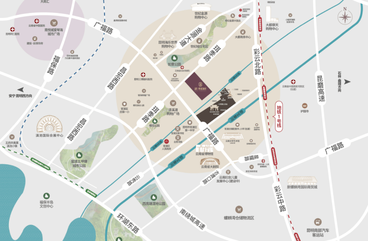 此外,地铁1/2号线、广福路、珥季路、彩云北路、昆玉高速、杭瑞高速等三维立体路网覆盖,全城随心畅达。