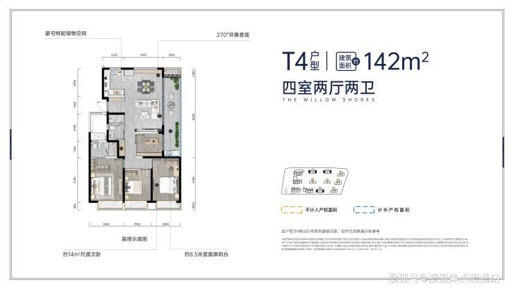 建面约142㎡(T4)品质横厅全明四房 3面采光|3卧室朝南|约8.5米大阳台