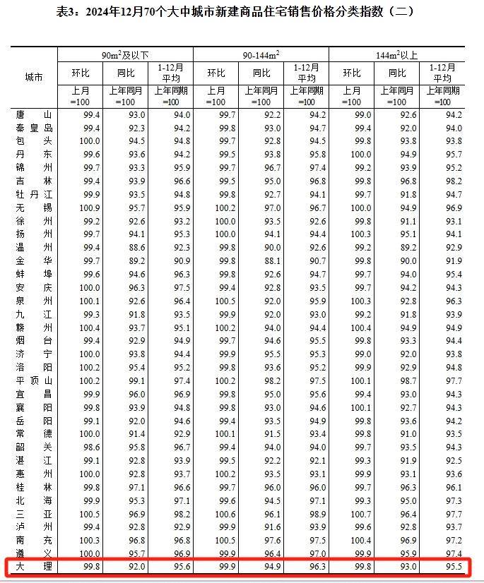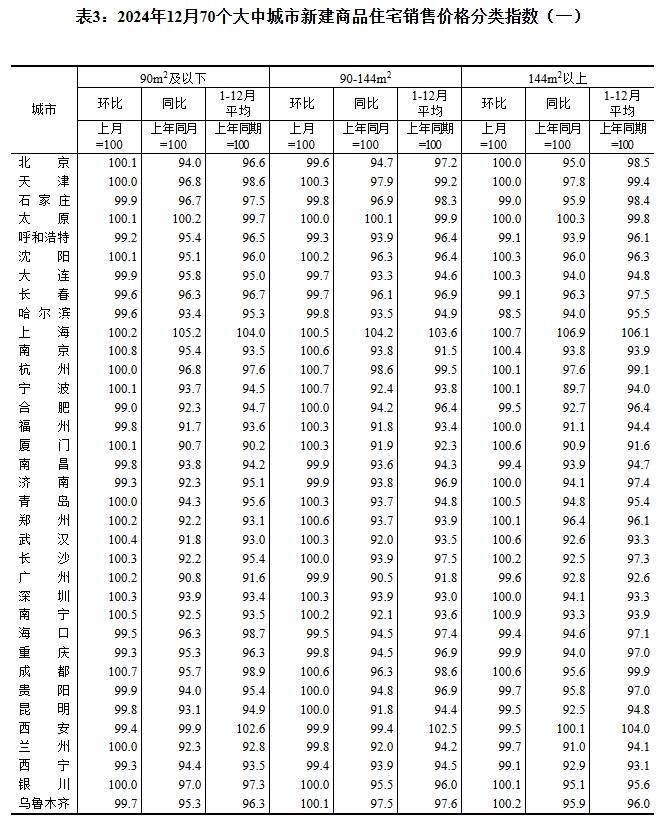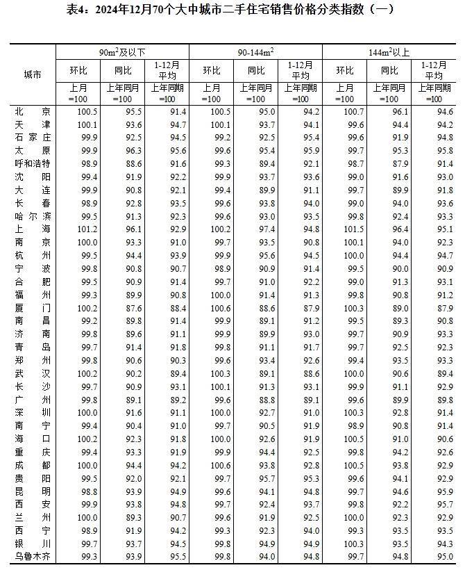 90-144㎡新建商品房销售价格环比下跌0.1%,同比下跌5.1%;
