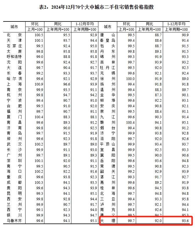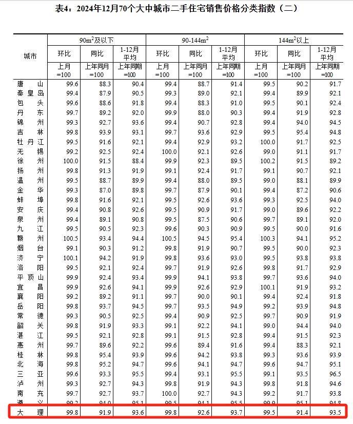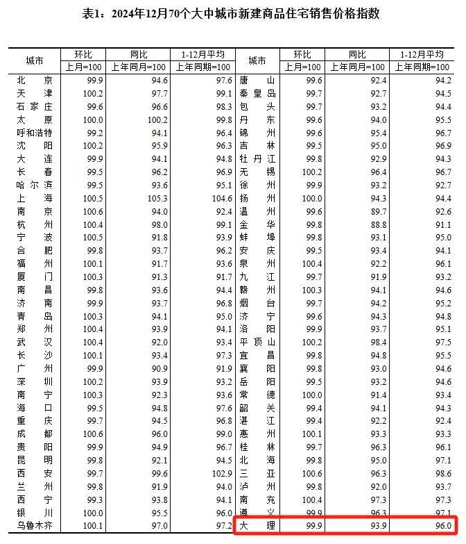 2024年12月大理市新房价格环比下跌0.1% 二手房价格环比下跌0.3%