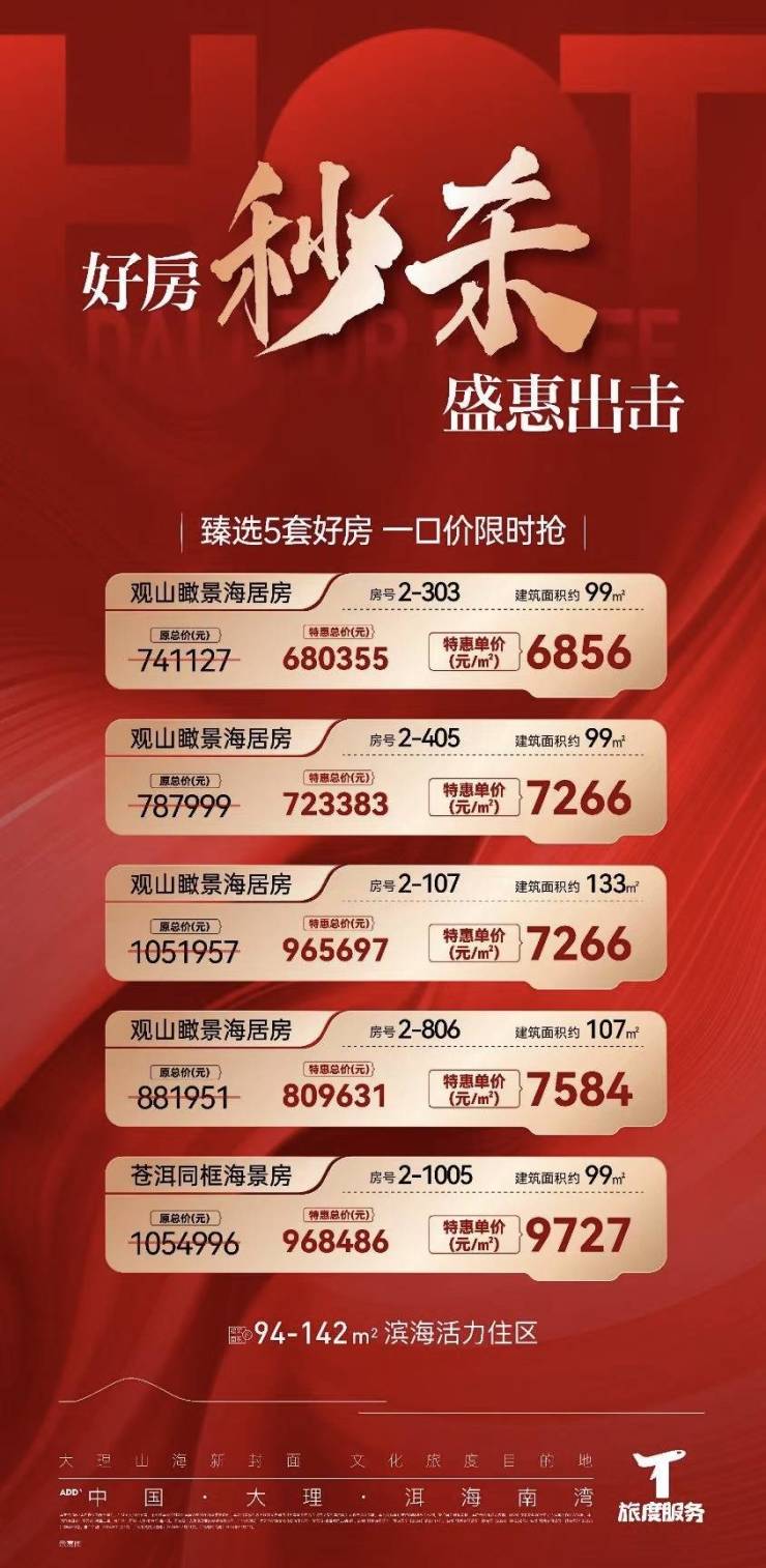 万科·大理·拾叁月,好房秒杀,盛惠出击,臻选5套好房,一口价限时抢!关注万科·大理·拾叁月的朋友可前往售楼处现场看房,咨询房源信息请拨打电话4001560036 转 415736!