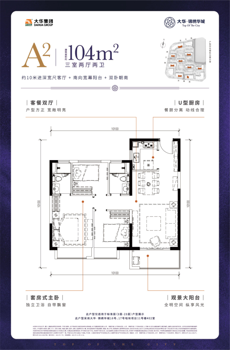 大华·锦绣华城│桃李郡16地块新品加推,1号楼建筑面积约104㎡宽逸三房和4号楼建筑面积约129㎡奢阔四房,出场即热销。建筑面积约104㎡三房,集实用与美观于一体,约10米进深宽尺客厅,归家通透明亮,待客舒适从容。U型全明厨房,烹饪收纳自由执掌,南向主卧套房带飘窗,奢适安逸,独立卫浴私密有度。