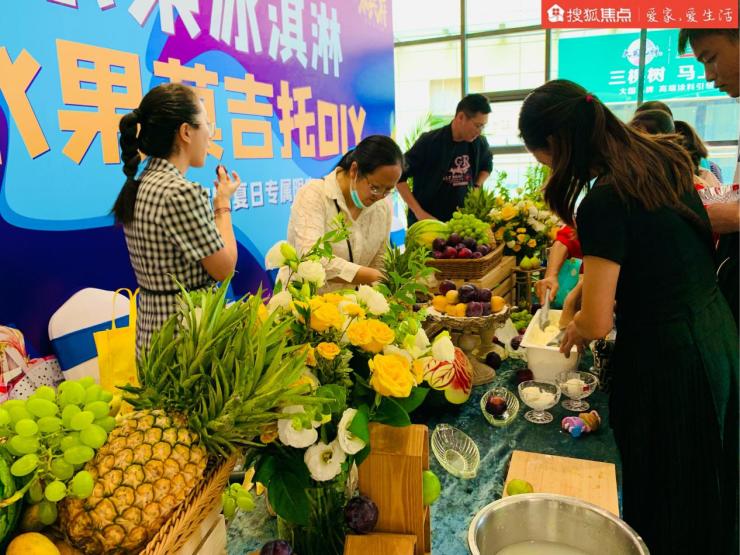 活动现场,嘉宾们或坐或站,围在活动的各个区域里,有人在DIY水果冰淇淋、有人在DIY水果莫吉托调酒,十分热闹。