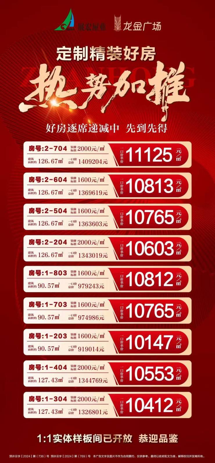 展宏·龙金广场,定制精装好房,热势加推,好房逐席递减中,先到先得!关注展宏·龙金广场的朋友可前往售楼处现场看房,咨询房源信息请拨打电话4001560036