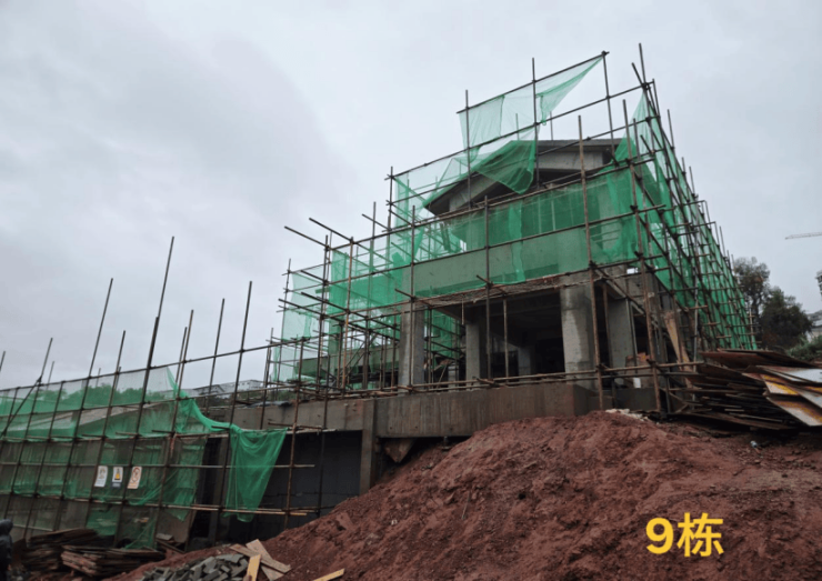 9栋主体封顶完成、砌体完成,内墙抹灰完成,外墙抹灰完成,屋面防水完成,腻子完成100%,露台压顶小青砖完成100%,窗框及固定玻璃安装完成,屋面盖瓦完成,室内二次电管网配管完成,给排水管安装完成,露台栏杆安装完成,涂料完成,外架拆除完成,室外钢楼梯安装完成,室外附属工程施工中;