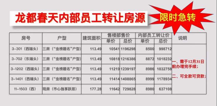 据搜狐焦点大理站获悉,大理龙都春天,内部员工转让房源,限时急转,单价约8500元/㎡起!