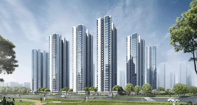 共9栋住宅,采用围合式布局,2T6 户设计,楼栋层高 25-34 层不等,规划约 1700 多户,车位配比约 1:1