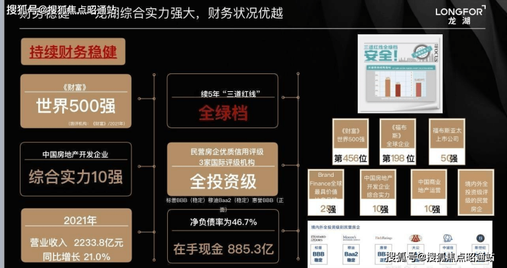 1.持续财务稳健:连续5年保持“三道红线”绿档水平;也是唯一一家同时获得三家国际评级机构“投资级”评级(标普BBB、穆迪Baa2、惠誉BBB)的民营房企;