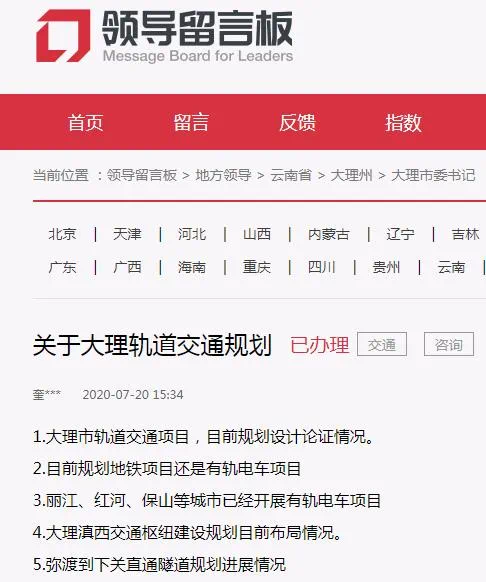 您通过人民网《地方领导留言板》给大理市委书记的留言收悉,大理市住房和城乡建设局高度重视,现将有关情况回复如下:2018年,国家对轨道交通项目审批政策进行了调整,目前大理市人口规模和财政收入等指标达不到审批要求,大理市轨道交通项目暂列为储备项目。