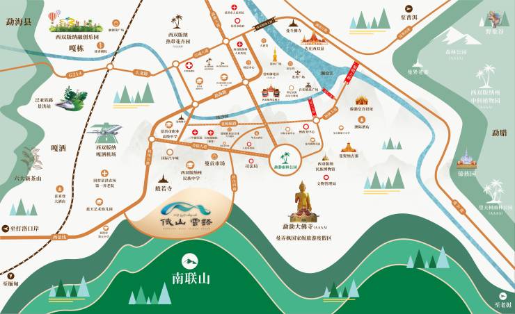 【自然资源】项目毗邻般若寺、勐泐雨林公园、千年傣王宫、勐泐大佛寺(4A)、流沙河湿地公园、民族博物馆、总佛寺、曼贺纳自然村寨,旅游景观资源环绕,畅享旅游新距离。