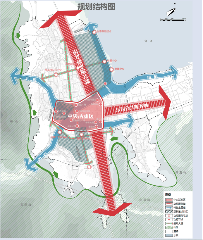 形成“一区两廊四轴,三道三片多点”的空间结构。