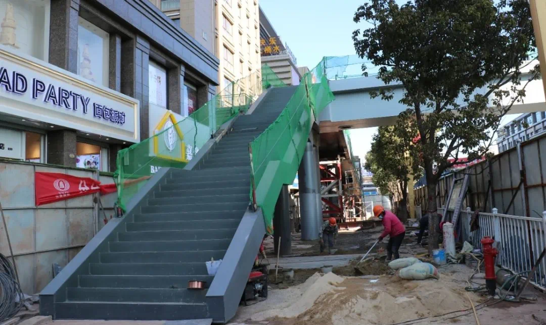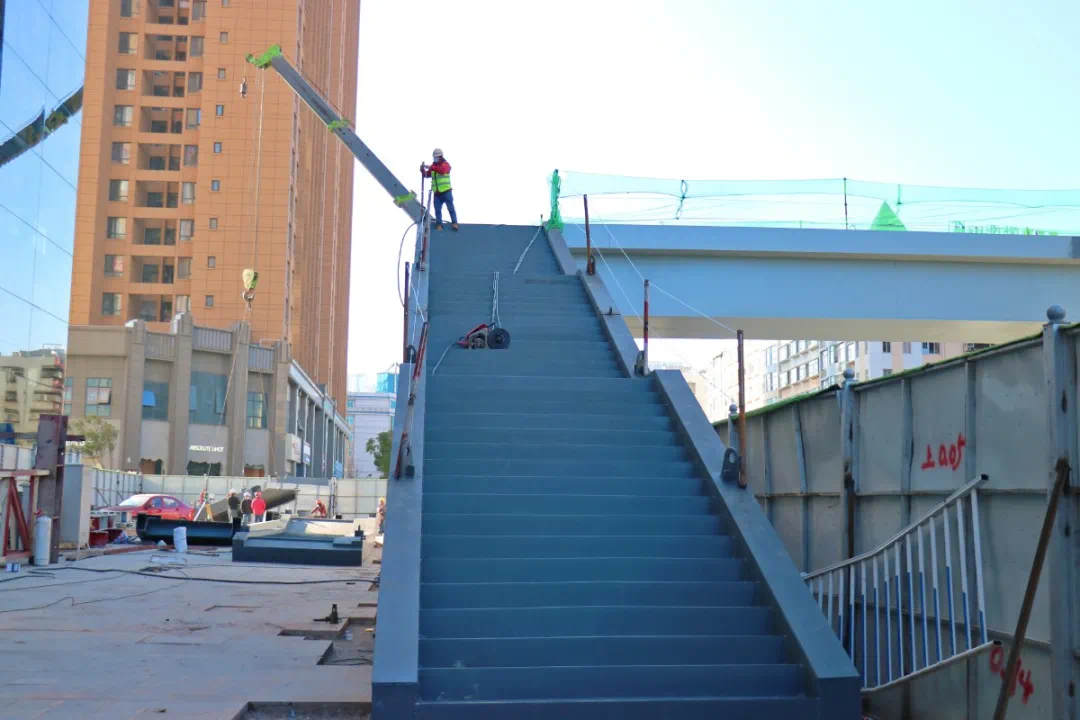 该工程于2020年11月1日开始进场施工,2021年1月22日开始制作支撑架吊装钢梁,于2021年1月25日完成吊装,并拆除支架。1月29日完成东西侧梯道安装。下一步将进行地砖的铺设和栏杆的安装。预计2月8日正式投入使用。