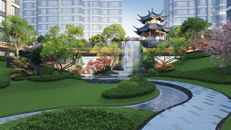 东方文化园林景观:项目于2.2万平方米的景观中,匠心打造5500平方米的住宅下沉庭院,整座园林荟萃亭、台、楼、阁、山、谷、溪、瀑、园九重意境,融汇诗、词、画、曲等文化精粹,构筑一幅可游可居的“地上文博馆”。