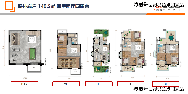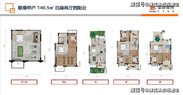户型:联排端户,140.5平方米,四室两厅四阳台;