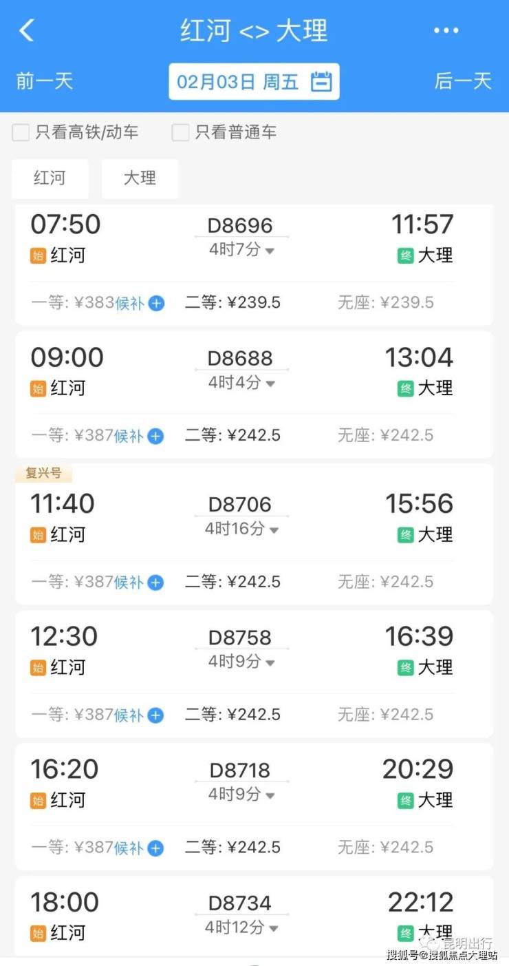 根据12306当前数据,红河至大理高峰将开行5.5对动车,昆楚大段经停站涉及广通北、禄丰南、南华、祥云等站,全程最快4小时4分。