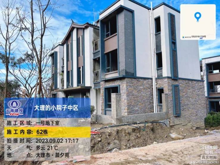 62栋砌体完成100%、内墙抹灰完成100%,外墙抹灰完成100%,屋面防水完成100%;外架拆除完成100%;室外抹灰收尾完成100%;室内防水施工完成10%,室内门窗收口完成100%;窗安装完成100%;外墙保温砂浆百分100%、抗裂砂浆完成100%,腻子粉完成100%,涂料完成100%;文化石完成85%,小青砖完成85%,屋面瓦施工完成;室内给水、二配安装完成。