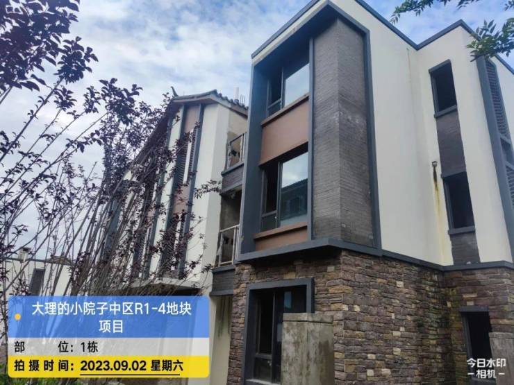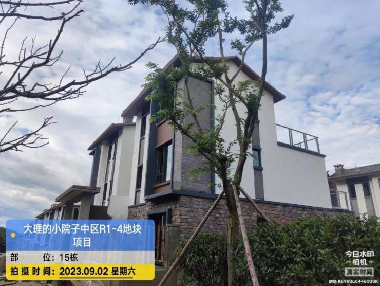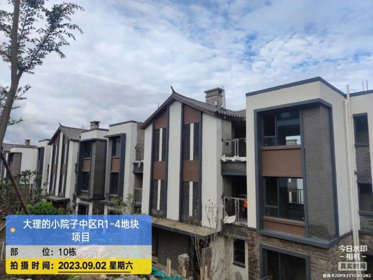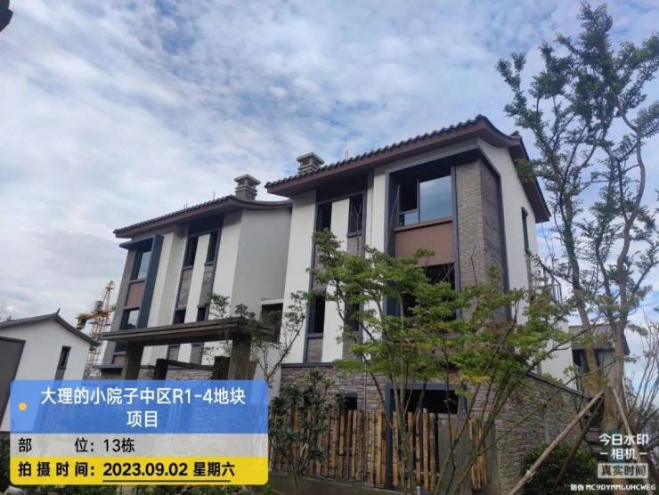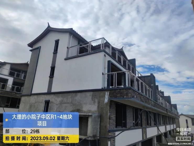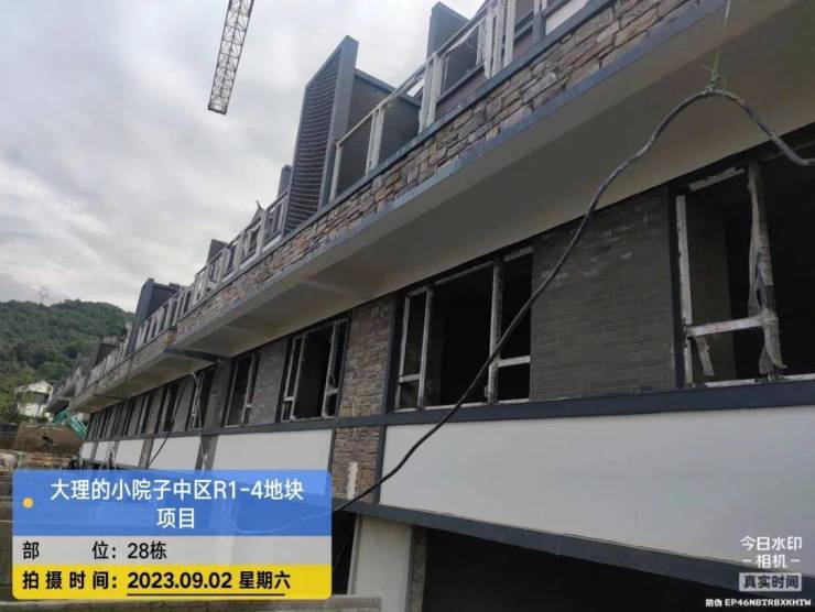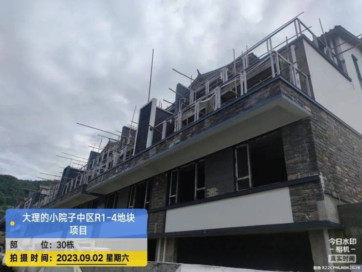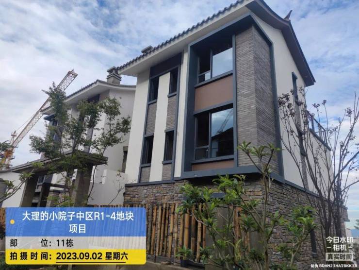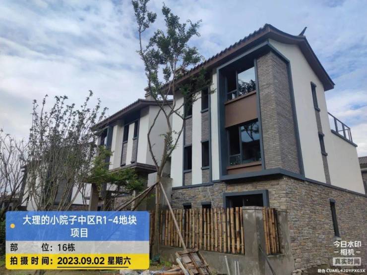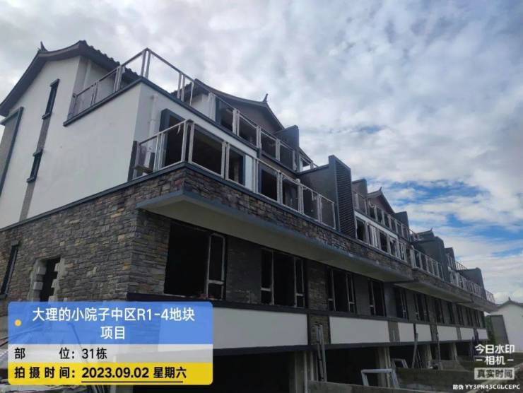 23栋砌体完成100%、内墙抹灰完成100%,外墙抹灰完成100%,屋面防水完成100%;外架拆除完成100%;窗安装完成100%;外墙保温砂浆百分100%、抗裂砂浆完成100%,腻子粉完成100%,涂料完成98%,文化石完成85%,小青砖完成85%;屋面瓦施工完成;庭院给排水管未安装,室内给排水、二配安装完成。