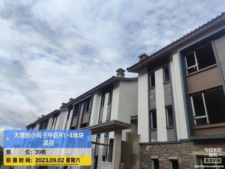 39栋砌体完成,内墙抹灰完成,外墙抹灰完成,外架拆除完成,屋面防水完成,露台防水完成。门窗安装完成70%;二层、三层栏杆安装完成100%;屋面瓦施工完成100%;外墙保温砂浆完成100%,抗裂砂浆完成100%;腻子完成100%,涂料完成100%,;文化石完成100%,小青砖完成100%,EPS线条完成100%。成品滴水线完成100%。镂空瓦完成100%。庭院给排水管未安装,室内给排水、二配安装完成。
