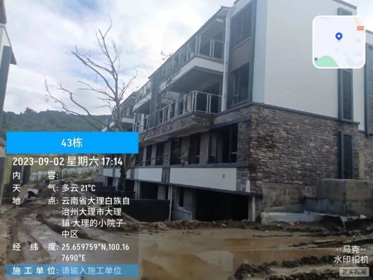 43栋砌体完成100%、内墙抹灰完成100%,外墙抹灰完成100%,屋面防水完成100%;外架拆除完成100%;窗安装完成100%;外墙保温砂浆百分100%、抗裂砂浆完成100%,腻子粉完成100%,涂料完成98%;文化石完成85%,小青砖完成85%,屋面瓦施工完成;庭院给排水管未安装,室内给排水、二配安装完成。