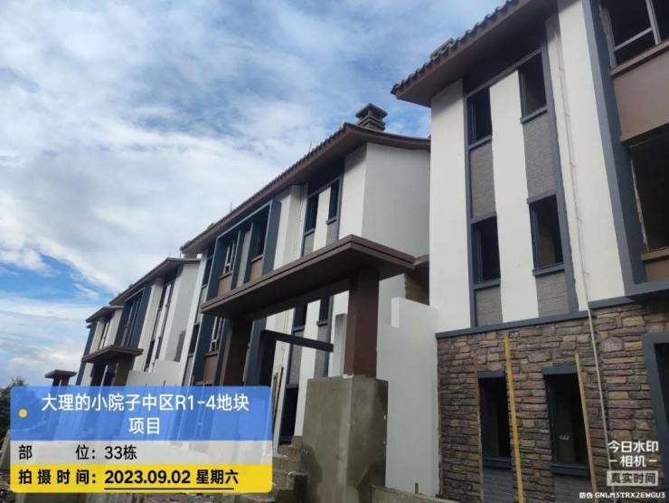 33栋砌体完成,内墙抹灰完成100%,外墙抹灰完成,屋面防水完成,露台防水完成。门窗安装完成50%;屋面瓦施工完成100%;外墙保温砂浆完成100%,抗裂砂浆完成100%;文化石完成100%,小青砖完成100%,EPS线条完成100%。腻子完成100%,涂料完成100%;庭院给排水管未安装,室内给排水、二配安装完成。