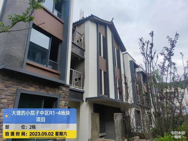 2栋砌体完成,内墙抹灰完成,外墙抹灰完成,外架拆除完成,屋面防水完成,庭院防水完成,露台防水完成,厨卫防水完成60%。二层、三层栏杆安装完成100%;屋面瓦施工完成100%;外墙保温砂浆完成完成100%,抗裂砂浆完成100%;腻子完成100%,涂料完成100%;文化石完成100%,小青砖完成100%,EPS线条完成100%。成品滴水线完成100%。镂空瓦完成100%。室外雨污水管网完成100%。室外给水管道完成100%;室内给排水、二配安装完成。