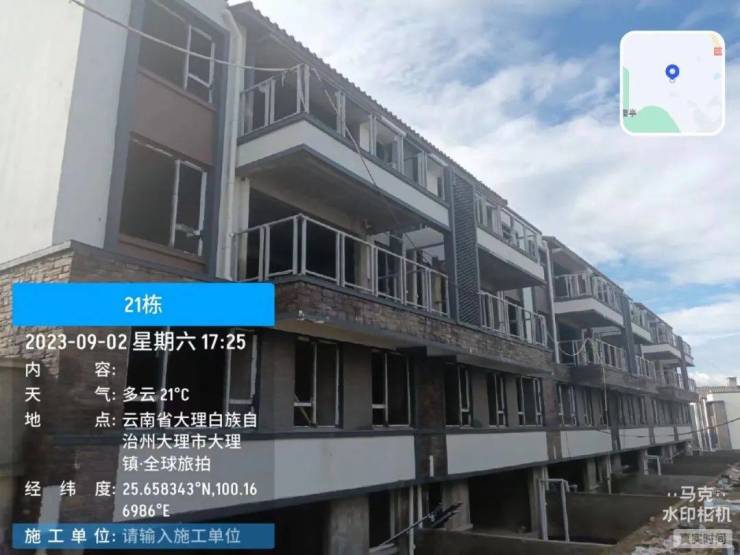 21栋砌体完成100%、内墙抹灰完成100%,外墙抹灰完成100%,屋面防水完成100%;外架拆除完成100%;窗安装完成100%;外墙保温砂浆百分100%、抗裂砂浆完成100%,腻子粉完成100%,涂料完成98%;文化石完成85%,小青砖完成85%,屋面瓦施工完成;庭院给排水管未安装,室内给排水、二配安装完成。